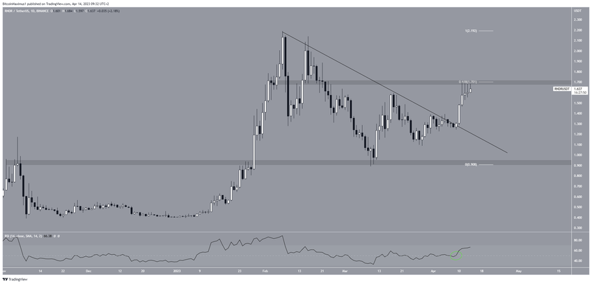 Kurs RNDR wybił się z opadającej linii oporu w dniu 10 kwietnia. Wybicie połączone było z ruchem RSI powyżej 50 (zielone kółko). Byczy trend tej kryptowaluty doprowadził dwa dni później do szczytu na poziomie 1,70 USD. Obecnie cena handluje poniżej obszaru oporu horyzontalnego i Fib na poziomie 1,70 USD.