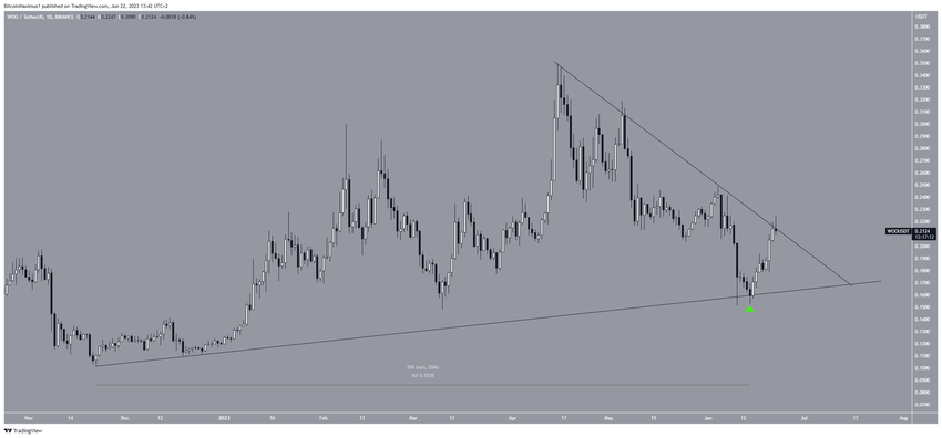 Jeśli jednak cena WOO zostanie odrzucona, może ponownie spaść do rosnącej linii wsparcia na poziomie 0,17 USD.