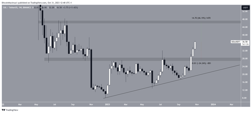 W następnym miesiącu SOL wybiła się z horyzontalnego obszaru przy 28 USD. Był to kluczowy obszar, ponieważ obowiązywał od listopada 2022 roku.