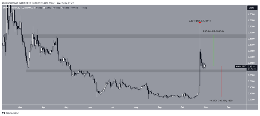 Cena MINA szybko wzrosła od dołka na poziomie 0,36 USD osiągniętego w dniu 11 października. Tylko 24 października cena wzrosła o 110%, prowadząc do szczytu na poziomie 0,98 USD.