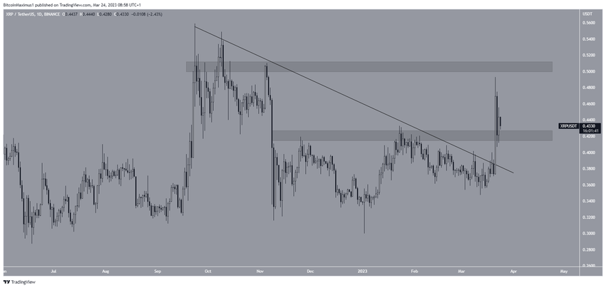 XRP wybił się z opadającej linii oporu w dniu 21 marca. Cena osiągnęła nowy roczny szczyt na poziomie 0,493 USD przed spadkiem. Następnie zweryfikowała obszar 0,430 USD jako wsparcie przed odbiciem.