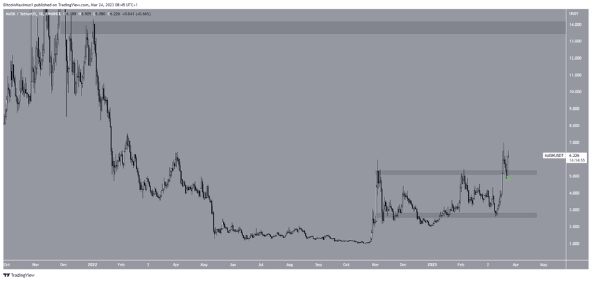 Cena MASK gwałtownie wzrosła od listopada 2022 roku. Podczas gdy trend wzrostowy zatrzymał się poniżej obszaru oporu na 5,95 USD, cena w końcu się z niego wybiła. Obecnie jest w trakcie zatwierdzania go jako oporu. Jeśli wzrost będzie kontynuowany, to następny najbliższy obszar oporu znajdowałby się przy 13,80 USD.