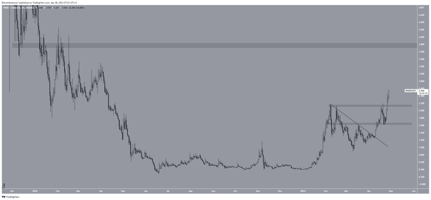 Cena RNDR wybiła się z obszaru horyzontalnego oporu przy 2,15 USD w dniu 26 kwietnia. Dwa dni później osiągnęła nowy roczny szczyt na 2,55 USD. Ze względu na brak oporu powyżej tego poziomu, akcja cenowa sugeruje, że ruch wzrostowy może dalej przyspieszać.