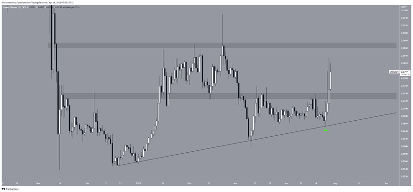 Cena CRO wzrastała wzdłuż wznoszącej się linii wsparcia od początku roku. Ostatnio odbiła się od tej linii w dniu 24 kwietnia (zielona ikona).
