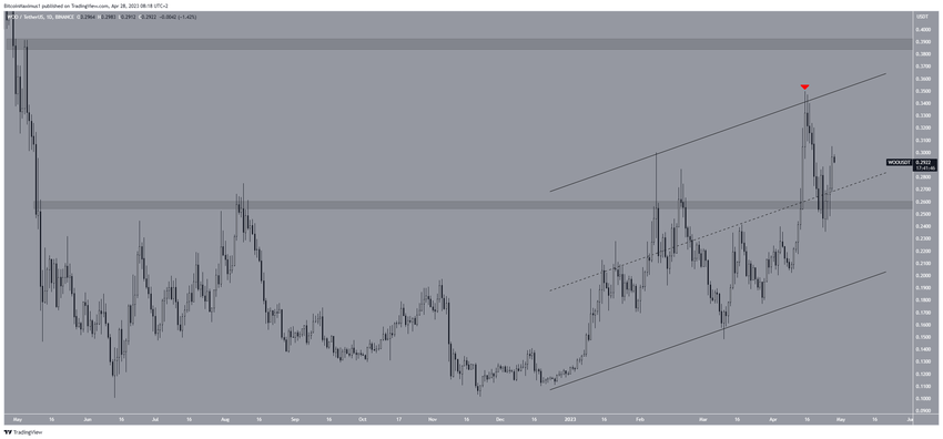 Jeśli wzrost będzie kontynuowany, WOO może dotrzeć do linii oporu kanału przy 0,36 USD. Jeśli jednak trend wzrostowy straci impet, WOO może ponownie spaść w rejon 0,26 USD.