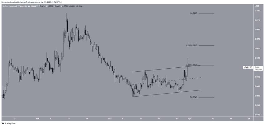 W dniu 31 marca cena HBAR została odrzucona zarówno przez linię oporu kanału jak i poziom oporu przy zniesieniu 0,382 Fib na poziomie 0,071 USD.