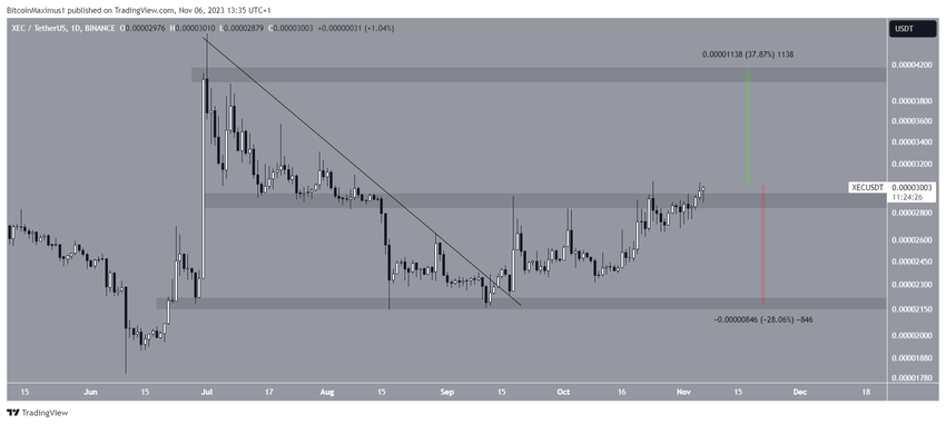 Pomimo tej byczej prognozy cenowej XEC, zamknięcie poniżej obszaru 0,000030 USD może spowodować spadek o 28% do najbliższego wsparcia na poziomie 0,000022 USD.