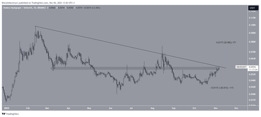 Cena HBAR znajduje się na krytycznym oporze. Tworzą go obszar oporu 0,057 USD i długoterminowa opadająca linia trendu oporu.
