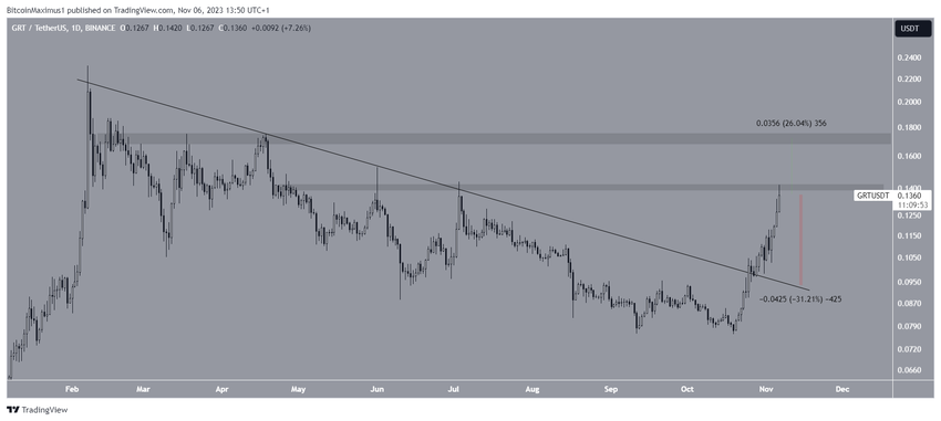 Cena GRT wybiła się z opadającej linii trendu oporu w dniu 25 października. Obecnie znajduje się tuż poniżej obszaru oporu na 0,135 USD. Jeśli dojdzie do wybicia, cena może wzrosnąć o kolejne 25% i osiągnąć następny opór na poziomie 0,170 USD.