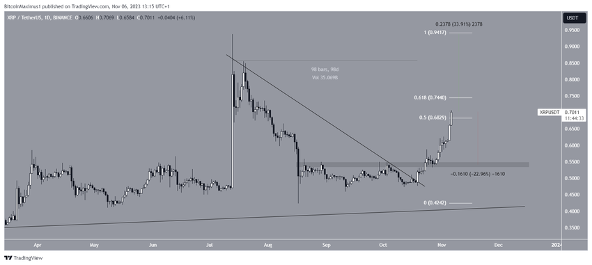 Cena XRP wybiła się z 98-dniowej opadającej linii trendu oporu w dniu 19 października. Obecnie znajduje się w bardzo interesującym obszarze pomiędzy poziomami oporu przy zniesieniu 0,5-0,618 Fib w zakresie 0,68-0,74 USD.