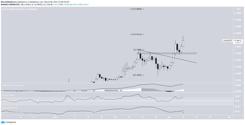 MANA również osiągnęła swoje ATH w dniu 8 marca i zbliża się do pierwszego obszaru oporu na poziomie 0,49 USD.
