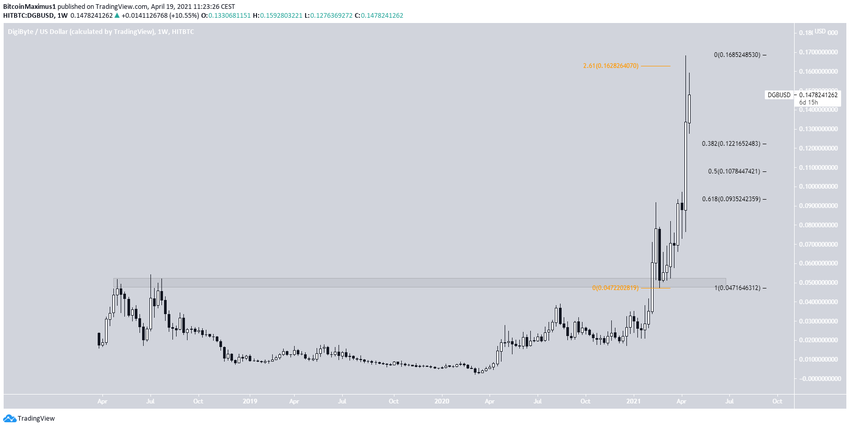 Tempo wzrostu jeszcze bardziej przyspieszyło w dniu 14 kwietnia. Trzy dni później DGB zdołał osiągnąć ATH o wartości 0,168 USD.