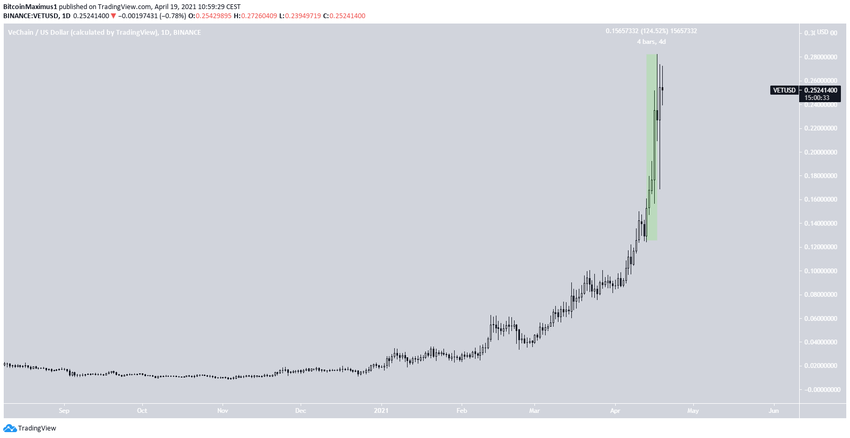 VET szybko rośnie od dnia 13 kwietnia. W ciągu zaledwie czterech dni wzrósł o 124,52%, osiągając ATH na poziomie 0,282 USD w dniu 17 kwietnia.
