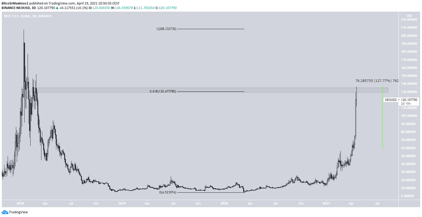 NEO szybko rośnie od czasu, gdy 12 kwietnia osiągnął poziom 59 USD. W dniu 19 kwietnia osiągnął lokalny szczyt na 136,35 USD, co oznacza wzrost o 127%.