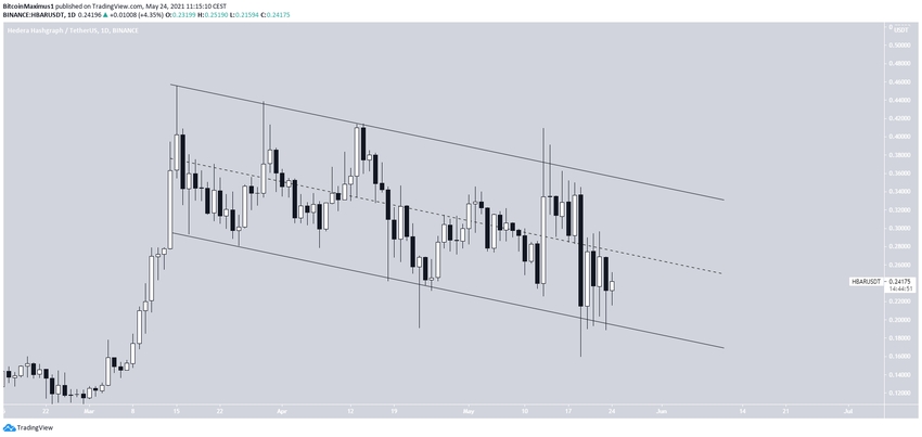 HBAR docierał do linii wsparcia kanału przez pięć kolejnych dni, począwszy od 19 maja. Nadal handluje w dolnej części kanału i jeszcze nie zainicjował ruchu w górę.