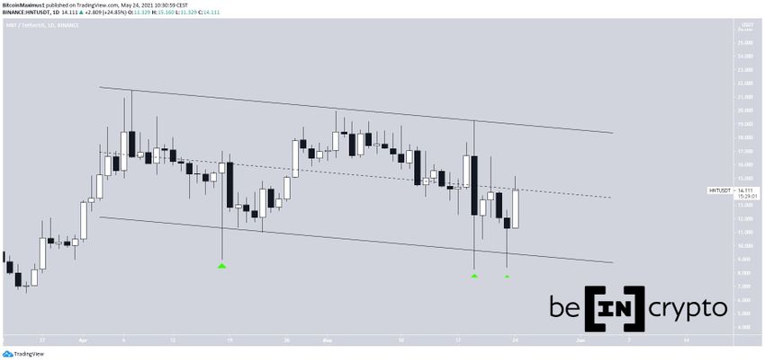 HNT to jedyna moneta, która w zeszłym tygodniu miała dodatnie notowania. Aktualnie znajduje się wewnątrz długoterminowego kanału spadkowego, w którym jest notowany od 7 kwietnia po osiągnięciu rekordu wszech czasów na poziomie 21,50 USD.