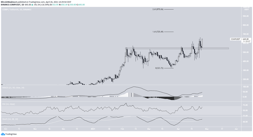 COMP od początku lutego walczył, aby przekroczyć obszar oporu w okoliach 545 USD. W końcu udało się to zrobić w dniu 23 kwietnia, osiągając przy okazji nowy ATH.