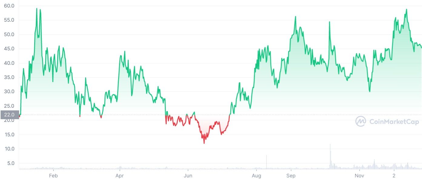 Drugie miejsce w top 5 przypadło projektowi Trust Wallet Token (TWT), którego cena od 1 stycznia 2022 roku skoczyła o 92%. Podobnie jak w przypadku poprzedniej kryptowaluty – GMX, Trust Wallet Token gwałtownie umacniał swoją pozycję w rankingu kryptowalut po upadku giełdy FTX w listopadzie tego roku. W 2022 roku token osiągnął również swoje ATH pod kątem całkowitego wolumenu. Wyniósł on bowiem aż 607 mln dolarów.