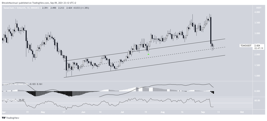 TOMO wzrasta od 19 maja. W dniu 8 lipca załamał się z kanału równoległego i powróciło do wsparcia w dniu 20 lipca (zielona ikona).