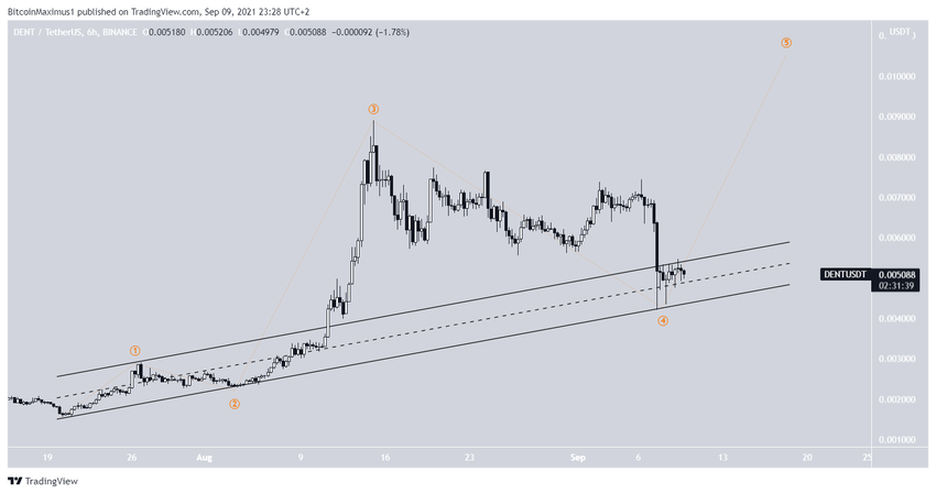 DENT porusza się w górę od 20 lipca. W dniu 11 sierpnia nastąpiło wybicie z równoległego kanału wzrostowego i 15 sierpnia kurs osiągnął szczyt na poziomie 0,0089 USD.