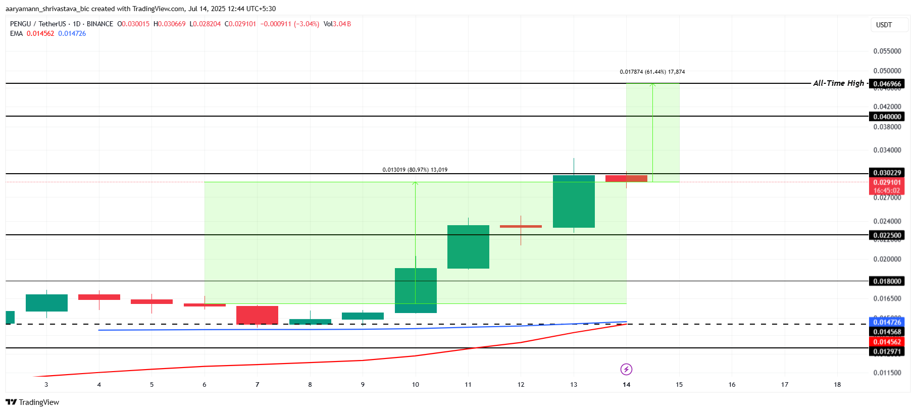 Mimo 61% różnicy od ATH, PENGU niedawno wzrósł o 30% w ciągu zaledwie 24 godzin. Z wykresem zbliżającym się do złotego krzyża, jest on gotowy na dalsze zyski. Jeśli ten impet się utrzyma, PENGU może przebić kluczowe poziomy oporu i wzrosnąć powyżej 0,030 USD, zbliżając się do ATH wynoszącego 0,046 USD.