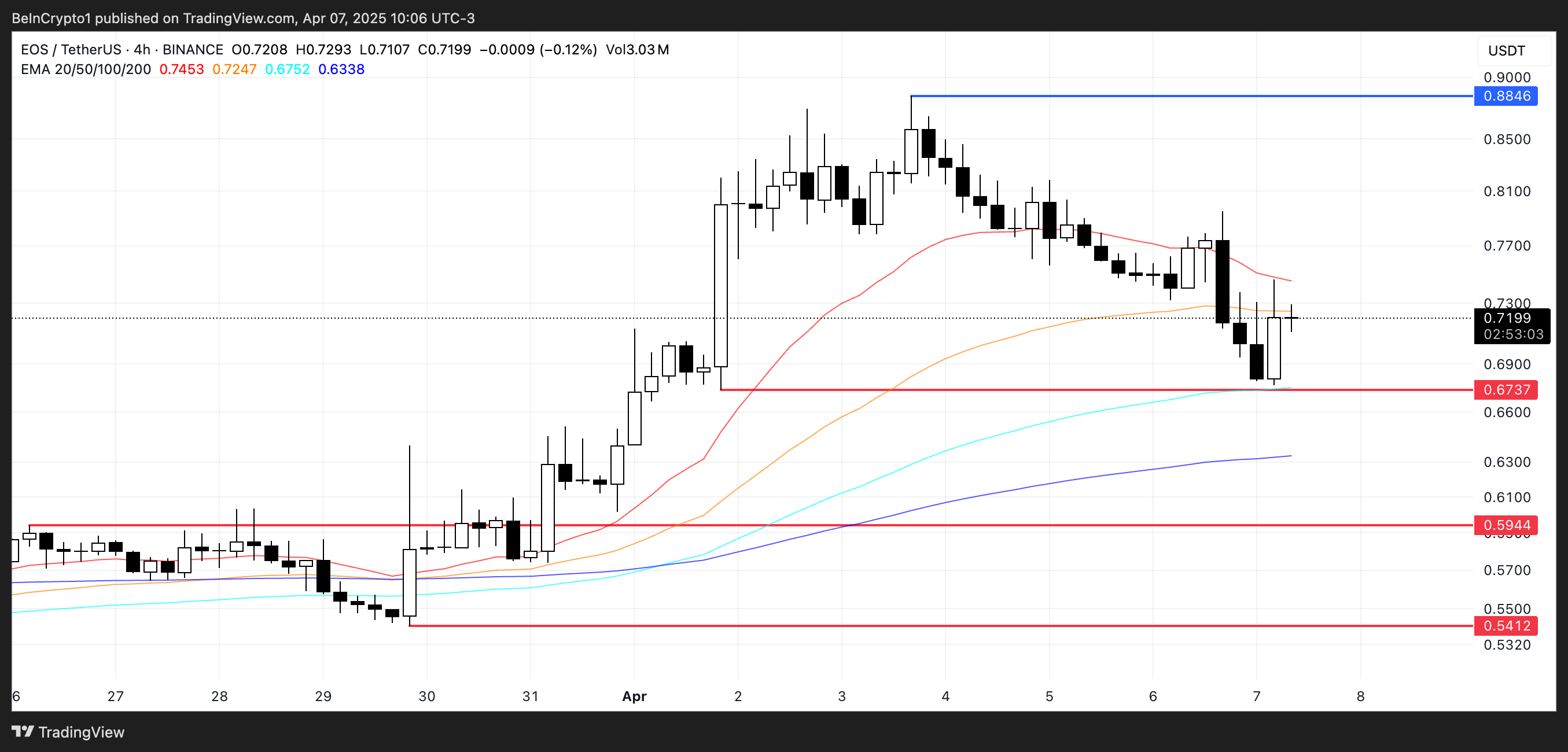 Jednak jeśli nastroje się zmienią i EOS podąży za spadkiem rynku, może spaść z powrotem do wsparcia na poziomie 0,67 USD. Jeśli ten poziom zawiedzie, mogą nastąpić dalsze spadki w kierunku 0,59 USD lub nawet 0,54 USD.