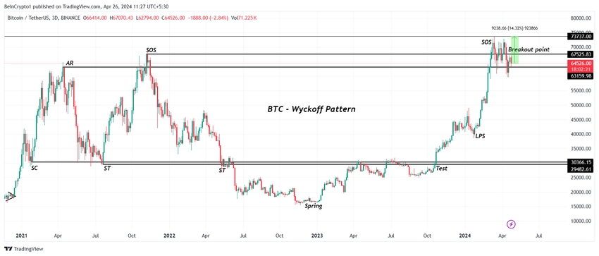 W szerszym horyzoncie czasowym cena Bitcoina podąża za wzorcem Wyckoffa, który dostarcza długoterminowych prognoz dla BTC. Jeżeli nastąpią wzrosty, to formacja zostanie potwierdzona.