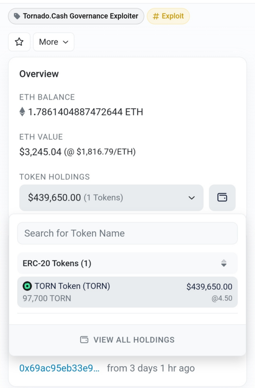 Popularny mikser kryptowalutowy Tornado Cash TORN spadł o ponad 30% po tym, jak złośliwy gracz przejął jego zarządzanie, aby ukraść ponad 480 000 tokenów z jego skarbca.