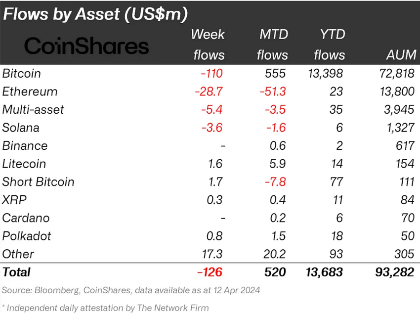 Dane na temat przepływów instytucjonalnych od CoinShares pokazują, że w tygodniu kończącym się 12 kwietnia XRP odnotował wpływy w wysokości zaledwie 0,3 mln USD. Jest to najniższa wartość spośród wszystkich aktywów, w tym Polkadot i Litecoin.