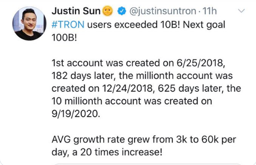 Sponsored19 września na Twitterze założyciela firmy Tron, Justina Sun, został opublikowany jako (teraz usunięty) tweet z napisem „Użytkownicy #TRON przekroczyli 10 miliardów! Następny cel 100B. ” Niesamowite twierdzenie wywołało zamieszanie i wesołość w równym stopniu w społeczności kryptowalut z kilku powodów. Głównym był fakt, że całkowita szacunkowa populacja planety nie osiągnęła jeszcze 8 miliardów ludzi.