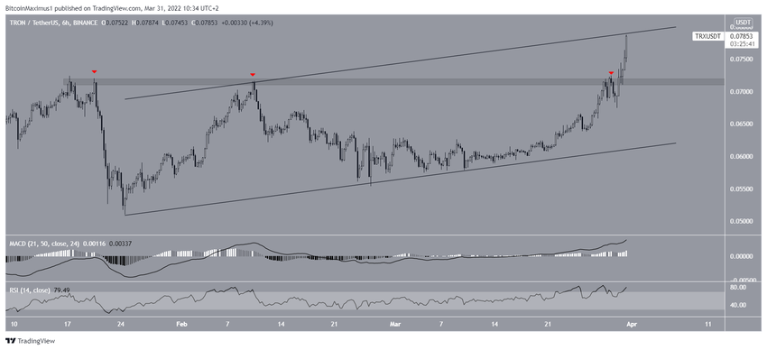 Wykres sześciogodzinny pokazuje, że TRON wybił się z obszaru oporu 0,0715 USD, który obowiązywał od dnia 16 stycznia. Cena wybiła się po trzech nieudanych próbach.
