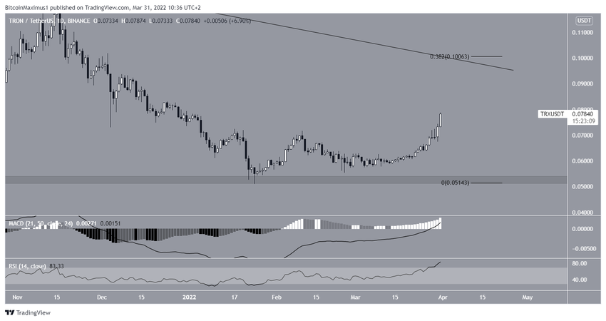 TRON (TRX) wzrasta od dnia 24 stycznia i udało mu się osiągnąć nowy roczny szczyt w dniu 31 marca.