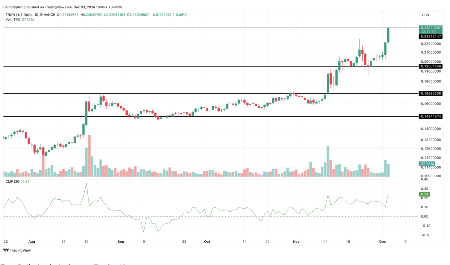 Spoglądając na dzienny wykres pary TRX/USD zauważyć można, że wskaźnik przepływu pieniędzy Chaikin (CMF) wzrósł. Jest to wskaźnik techniczny, który ocenia przepływ pieniędzy do i z aktywów w określonym przedziale czasowym.