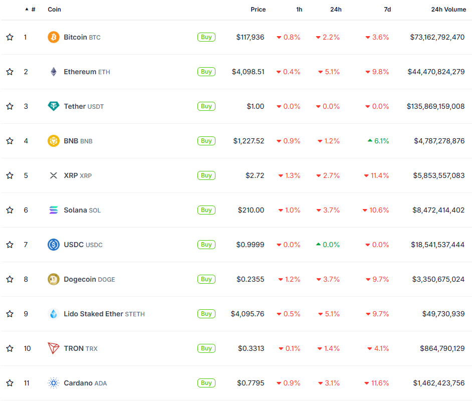 Bitcoin spadł o 1,9% do 118 000 USD, podczas gdy Ethereum zniżkował o 4,7% do 4104 USD. Altcoiny poniosły większe straty, z Solaną i XRP spadającymi o ponad 2% każda.