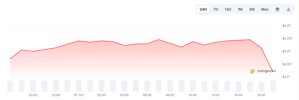 Według CoinGecko całkowita kapitalizacja rynku kryptowalut spadła z około 4,27 bln USD do 4,10 bln USD. Ruch ten odzwierciedlał reakcję Wall Street, gdzie S&P 500 stracił 1,2 bln USD wartości w 40 minut.