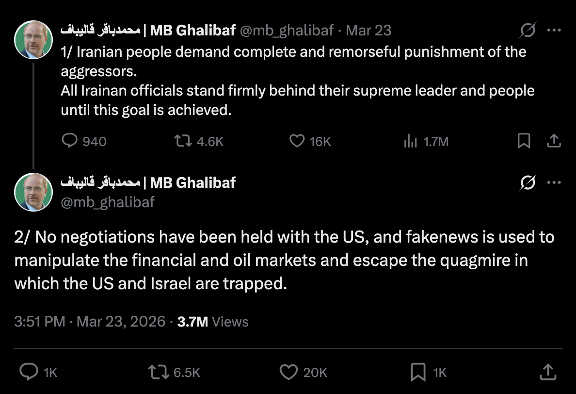 Odpowiedź Teheranu na informacje od Trumpa była jednoznaczna. Przewodniczący parlamentu Mohammad Bagher Ghalibaf określił to jako „fake news” mające na celu manipulację rynkami finansowymi i naftowymi.