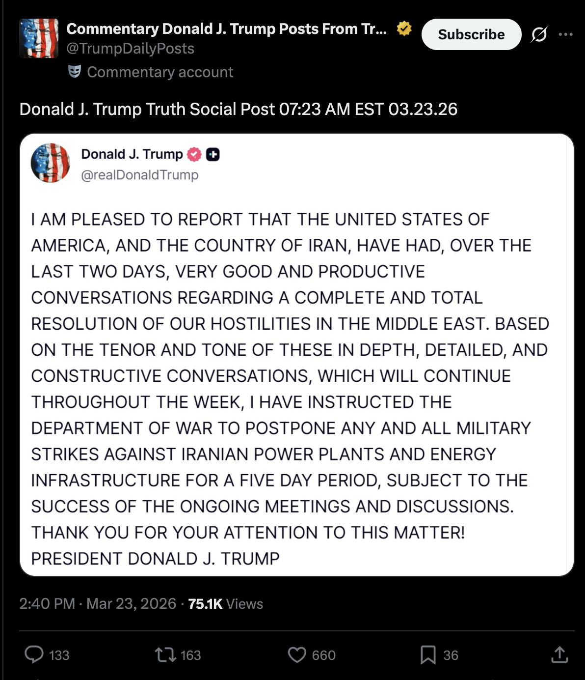 Zamiast podjąć działania, Trump opublikował w poniedziałek o 7:00 ET post, w którym ogłosił, że prowadził „bardzo dobre i produktywne rozmowy” z Teheranem. Zapowiedział 5-dniową zwłokę we wszystkich atakach na infrastrukturę energetyczną.