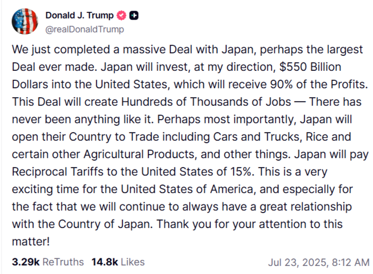 Japonia zainwestuje 550 mld USD w USA i będzie podlegać 15% cłom na import. Jednocześnie otworzy swoje rynki na amerykańskie samochody i produkty rolne. Jen początkowo wzrósł na wieść o tym.