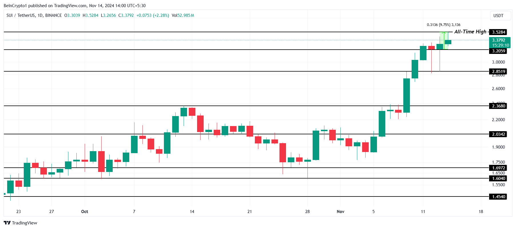 Rynek kryptowalut z SUI na czele odnotował wzrost o 9,75% w ciągu ostatnich 24 godzin, osiągając nowe ATH na poziomie 3,52 USD. Mimo tego skromnego wzrostu, nowy rekord wszech czasów stanowi znaczący kamień milowy dla ostatniego trendu wzrostowego altcoina.