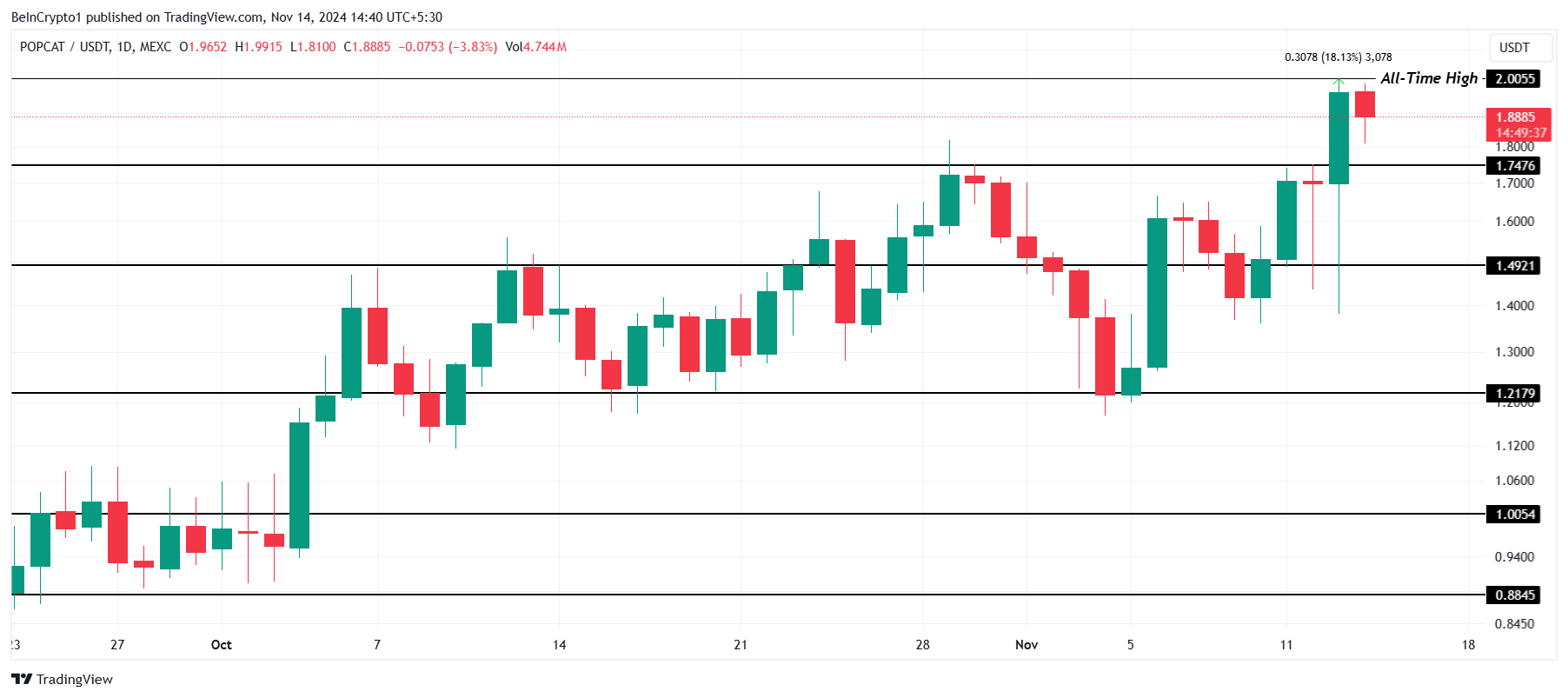 Obecnie handlując po 1,88 USD, POPCAT przechodzi łagodną korektę, aczkolwiek cena tokena ustanowiła solidny poziom wsparcia na 1,74 USD. To wsparcie służy jako zabezpieczenie, pomagając zapobiec znacznym stratom i utrzymując pozytywne nastawienie wokół memecoina.