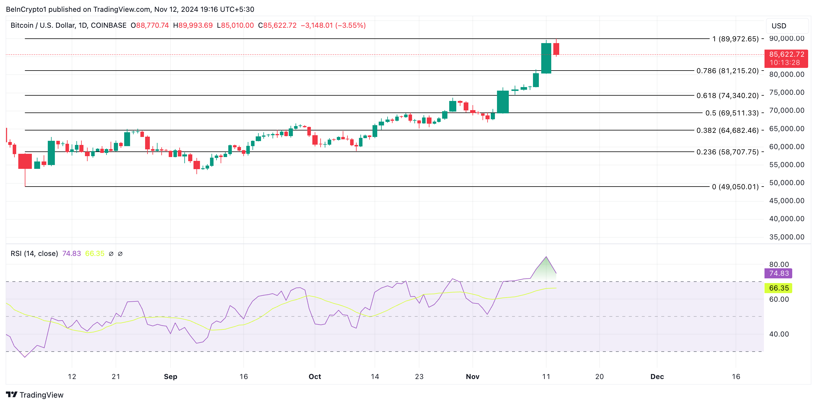 Odczyty z indeksu siły względnej (RSI) dla Bitcoina potwierdzają powyższą ostrożną perspektywę. W chwili pisania tego tekstu, RSI monety wynosi 74,83.