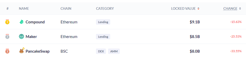 Rynek DeFi przeżywał mocne spadki w ciągu ostatnich 24 godzin, a łączna wartość spadła o 39% od szczytu z 11 maja. Tego dnia, według DeBank, całkowita wartość zablokowana wyniosła około 131 miliardów dolarów.