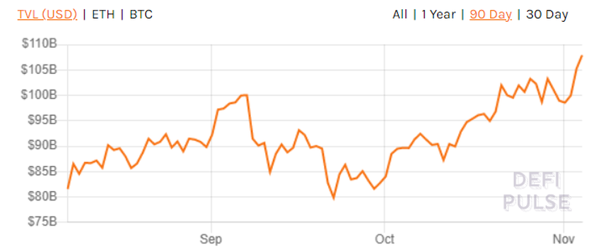 Rynek DeFi nie wykazuje żadnych oznak spowolnienia, ponieważ całkowita wartość zablokowana osiągnęła 3 listopada 2021 roku nowy rekord wszech czasów na poziomie 106,9 miliarda dolarów. Nowy rekord oznacza dość stabilny wzrost w ciągu roku, do którego przyczyniło się kilka nowych projektów i uruchomień związanych z NFT.