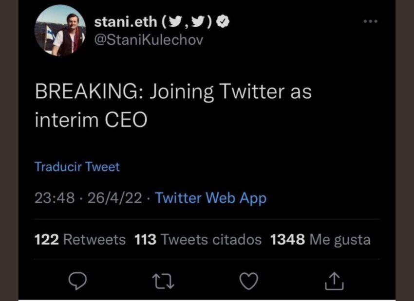 Założyciel Aave poinformował we wtorek 173 tys. swoich zwolenników, że dołącza do Twittera jako tymczasowy dyrektor generalny. Tweet ten przez wielu został uznany za żart, inni uznali go za mylący.