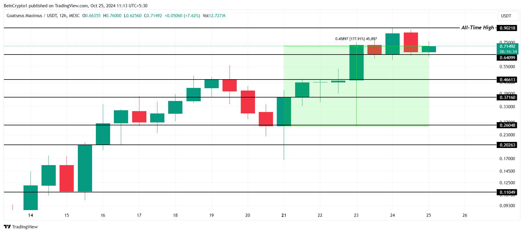 GOAT zanotował imponujący wzrost w tym tygodniu, rosnąc o 177% i osiągając rekordowy poziom 0,902 USD. Obecnie memecoin stabilnie utrzymuje się powyżej poziomu wsparcia 0,640 USD, co stanowi kluczowy fundament wzmacniający zaufanie inwestorów. Ta wydajność przyciągnęła znaczną uwagę do GOAT jako jednej z najlepiej radzących sobie memecoinów w ostatnich dniach.