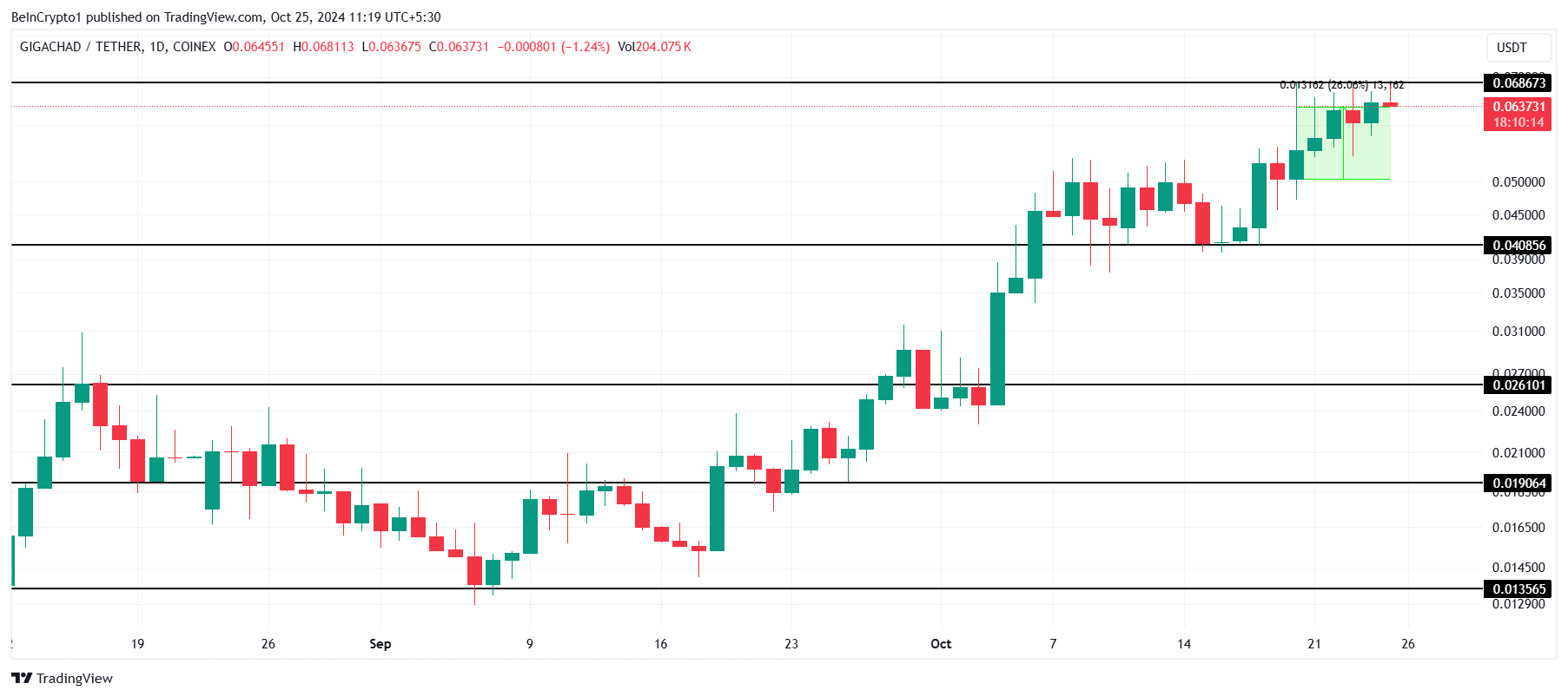 W tym tygodniu świat memecoinów wyróżnił również Gigachad. GIGA może nie doświadczyć masowego wzrostu jak inne memecoiny, ale token osiągnął stopniowy wzrost o 26%. Ta konsekwentna wydajność jest godna uwagi, zwłaszcza biorąc pod uwagę stabilność kryptowaluty w ostatnich tygodniach.