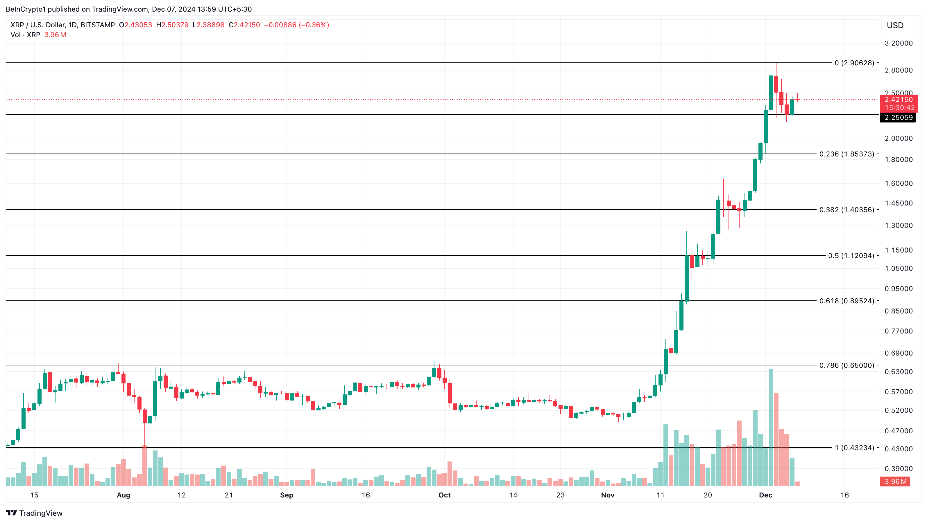 Tymczasem dalsza ocena wykresu dziennego pokazuje, że korekta XRP z poziomu 2,72 USD pomogła znaleźć wsparcie na poziomie 2,25 USD. Z kolei, poniższy obraz ujawnia niższy wolumen obrotu wokół altcoina, sugerując, że kolejny dodatni ruch ceny XRP może nie nastąpić w krótkim terminie.