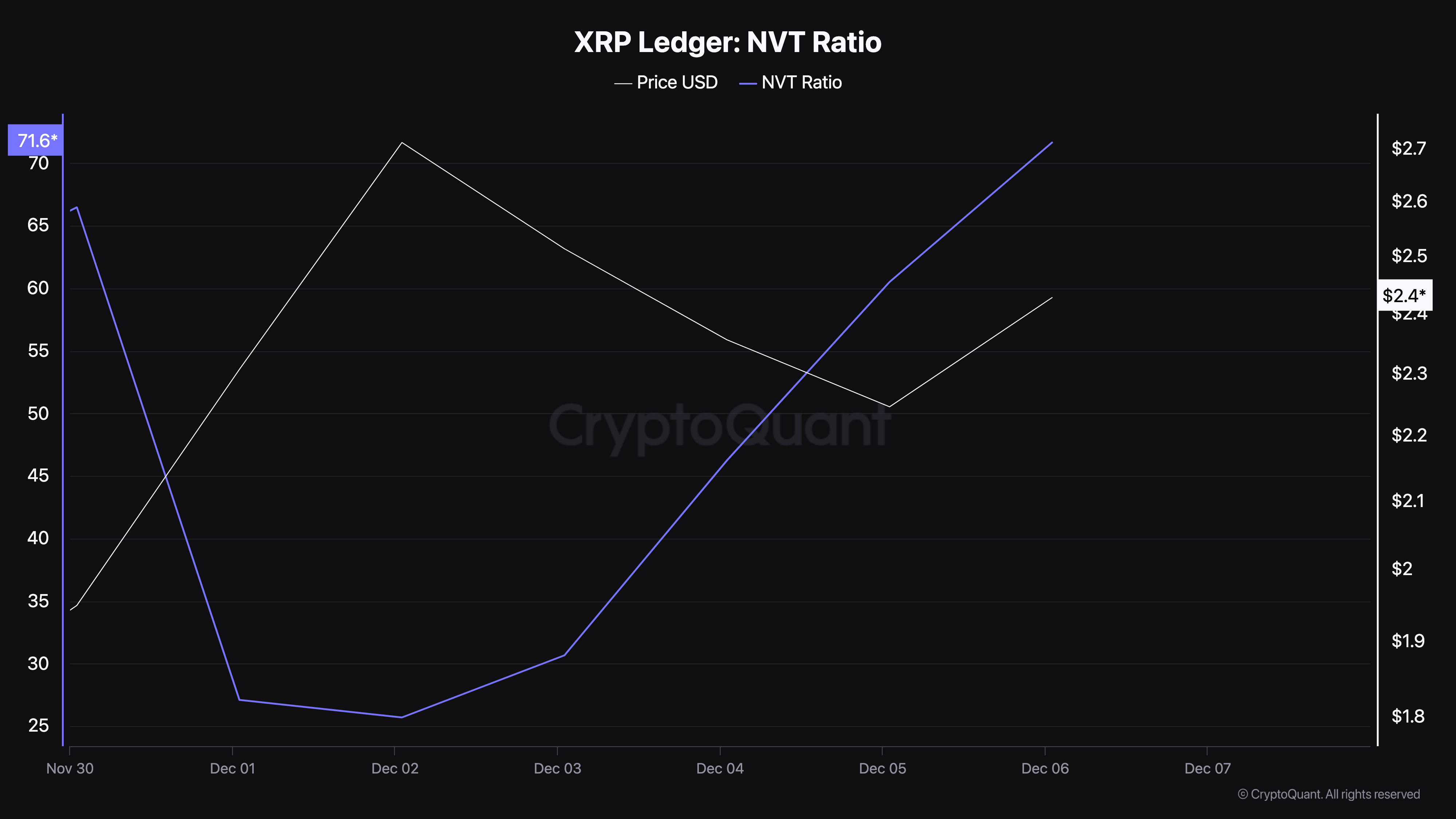 Jednym ze wskaźników sugerujących, że XRP może zatrzymać swój wzrost jest wskaźnik wartości sieci do transakcji (NVT). Wskaźnik ten sprawdza, czy kapitalizacja rynkowa kryptowaluty rośnie szybciej niż jej wolumen transakcji. Jest to kluczowy wskaźnik do oceny, czy moneta jest przewartościowana czy niedowartościowana.