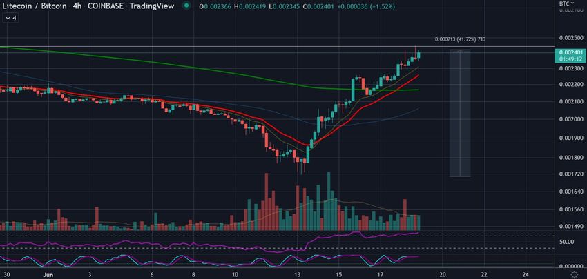 Inwestor kryptowalutowy @traderrocko napisał na Twitterze, że wykres LTC/BTC wzrósł o 40% od czerwcowych dołków.