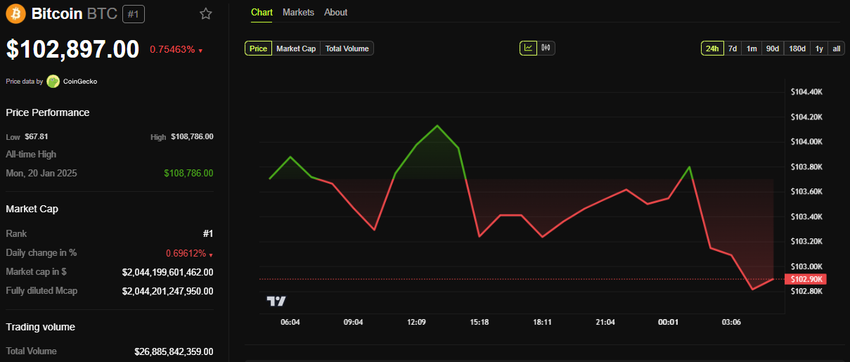 W momencie pisania tego tesktu Bitcoin był notowany na poziomie 102 897 USD. Natomiast analitycy sugerują, że akumulacja na poziomie państwowym może wywołać nową presję wzrostową na cenę cyfrowego aktywa. CryptoGoos, entuzjasta aktywów cyfrowych zauważył: